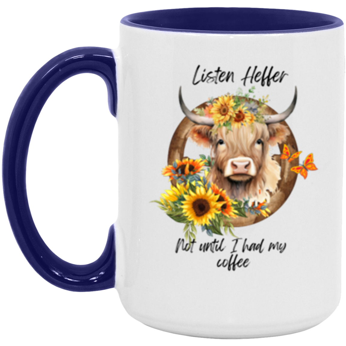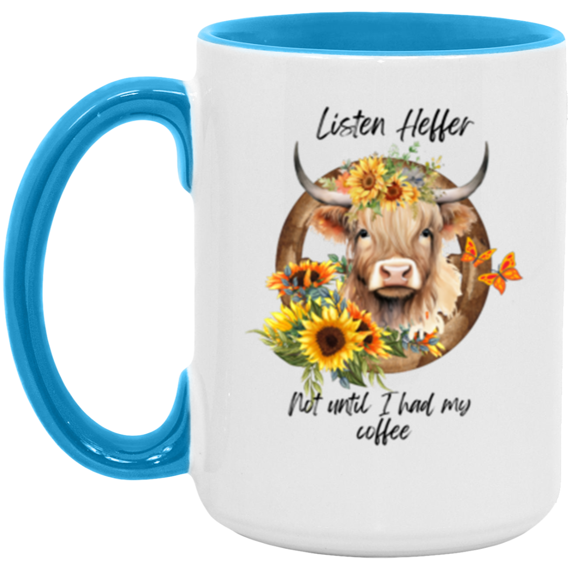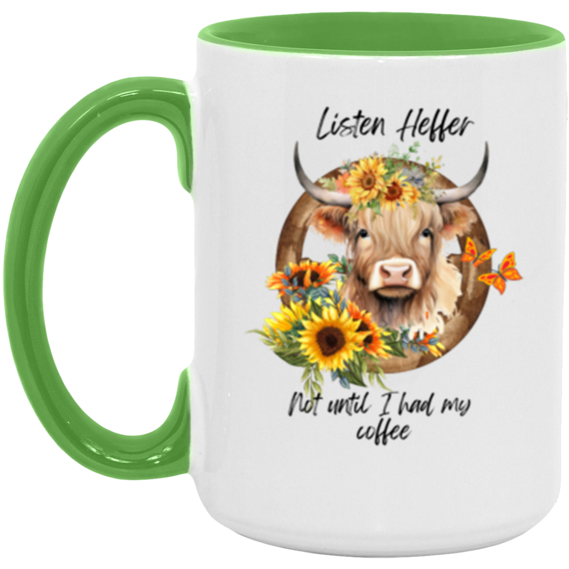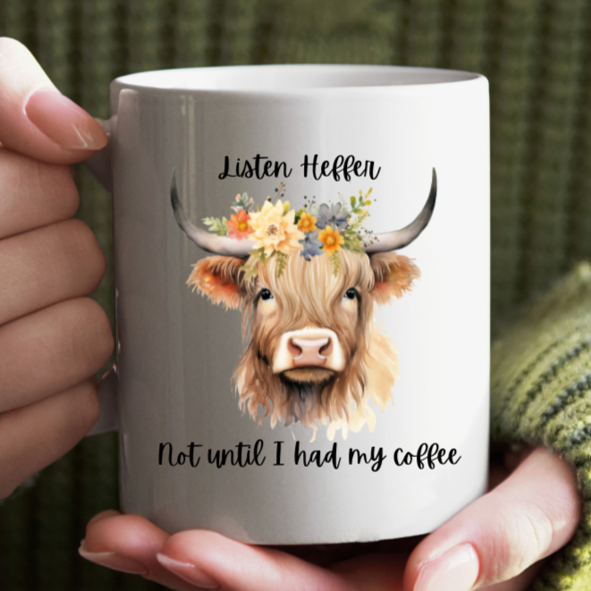 Listen Heffer Not Until I Had My Coffee! Makes a perfect gift for anyone who loves coffee and cows!
