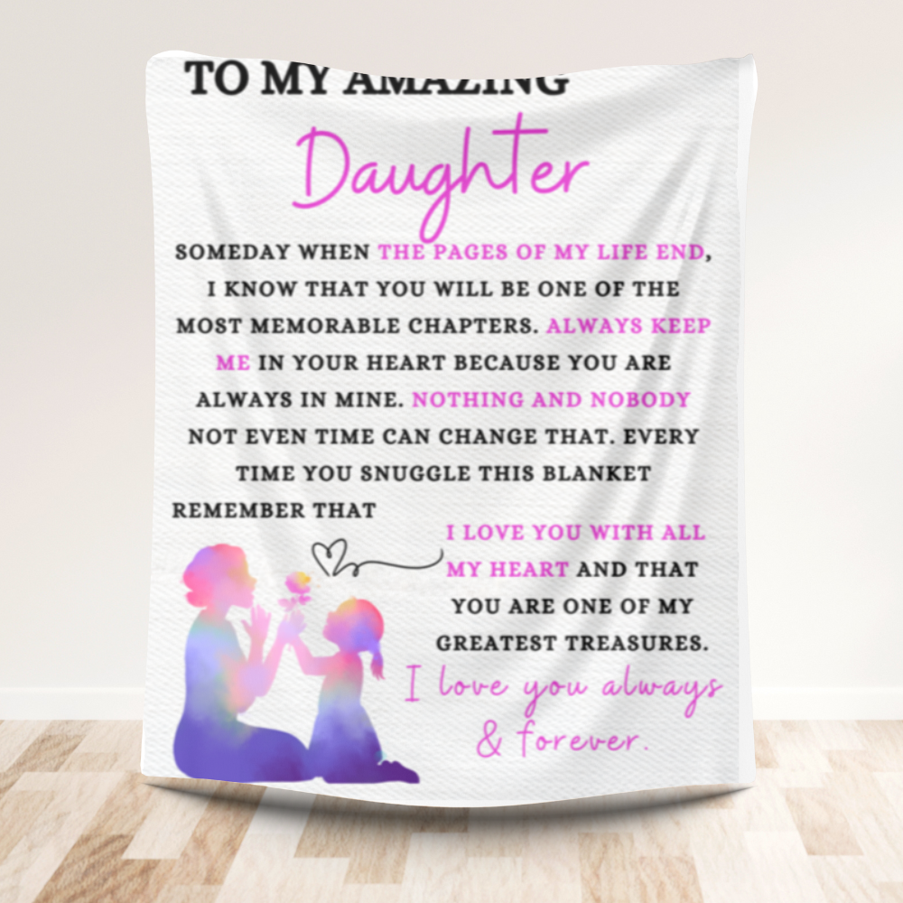 TO MY AMAZING Daughter SOMEDAY WHEN THE PAGES OF MY LIFE END, I KNOW THAT YOU WILL BE ONE OF THE MOST MEMORABLE CHAPTERS. ALWAYS KEEP ME IN YOUR HEART BECAUSE YOU ARE ALWAYS IN MINE. NOTHING AND NOBODY NOT EVEN TIME CAN CHANGE THAT. EVERY TIME YOU SNUGGLE THIS BLANKET REMEMBER THAT I LOVE YOU WITH ALL MY HEART AND THAT YOU ARE ONE OF MY GREATEST TREASURES. I love you always & forever.