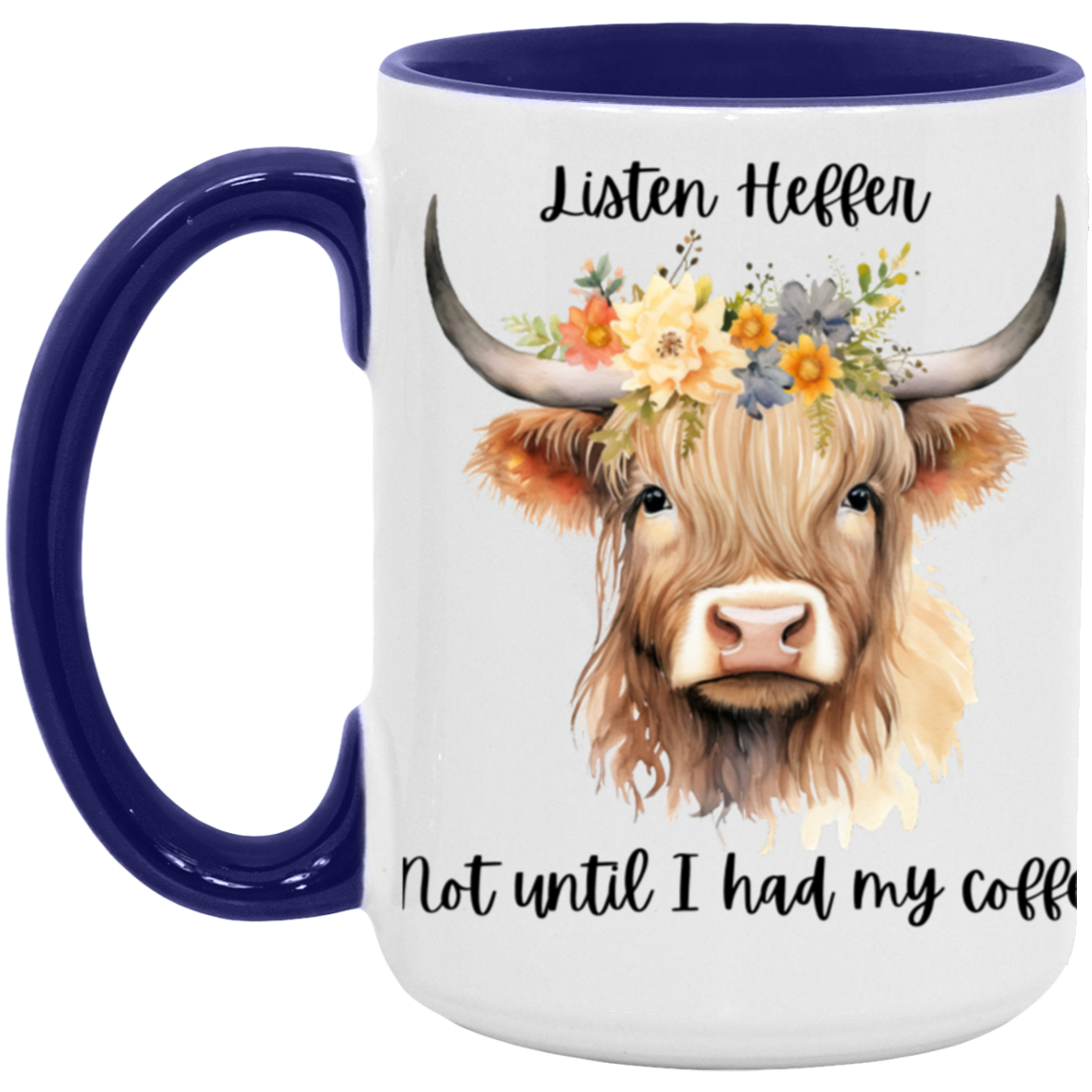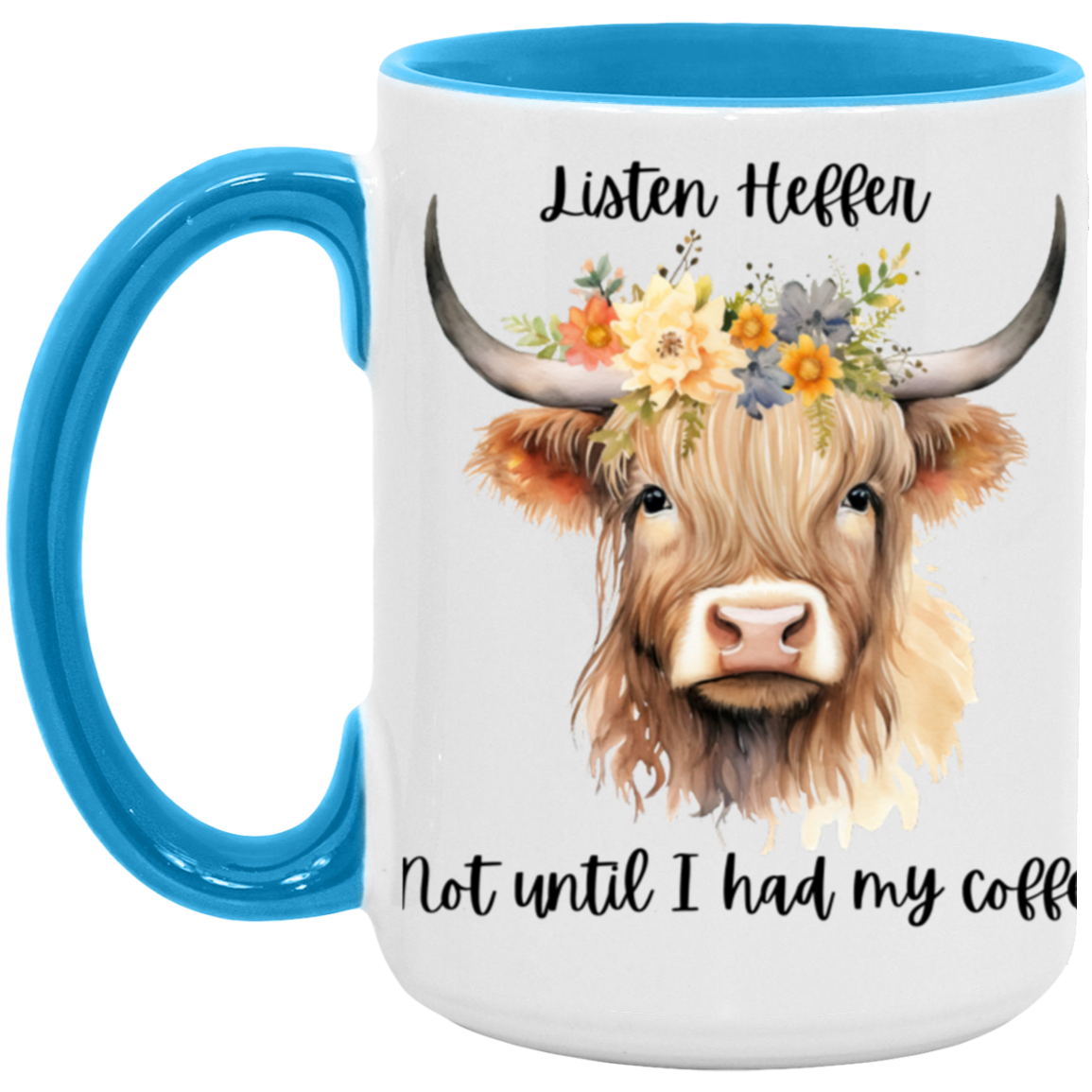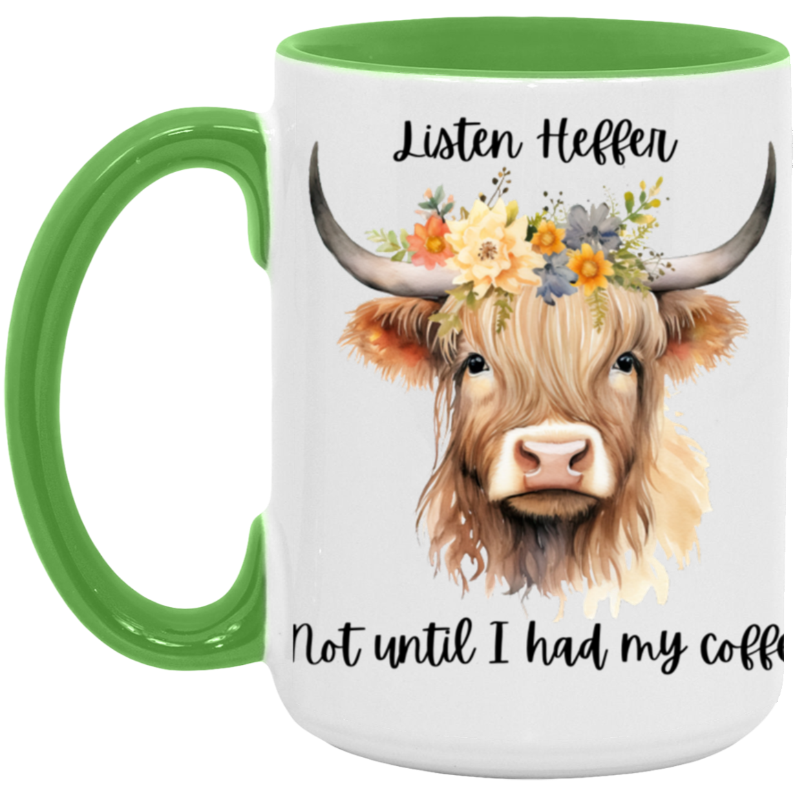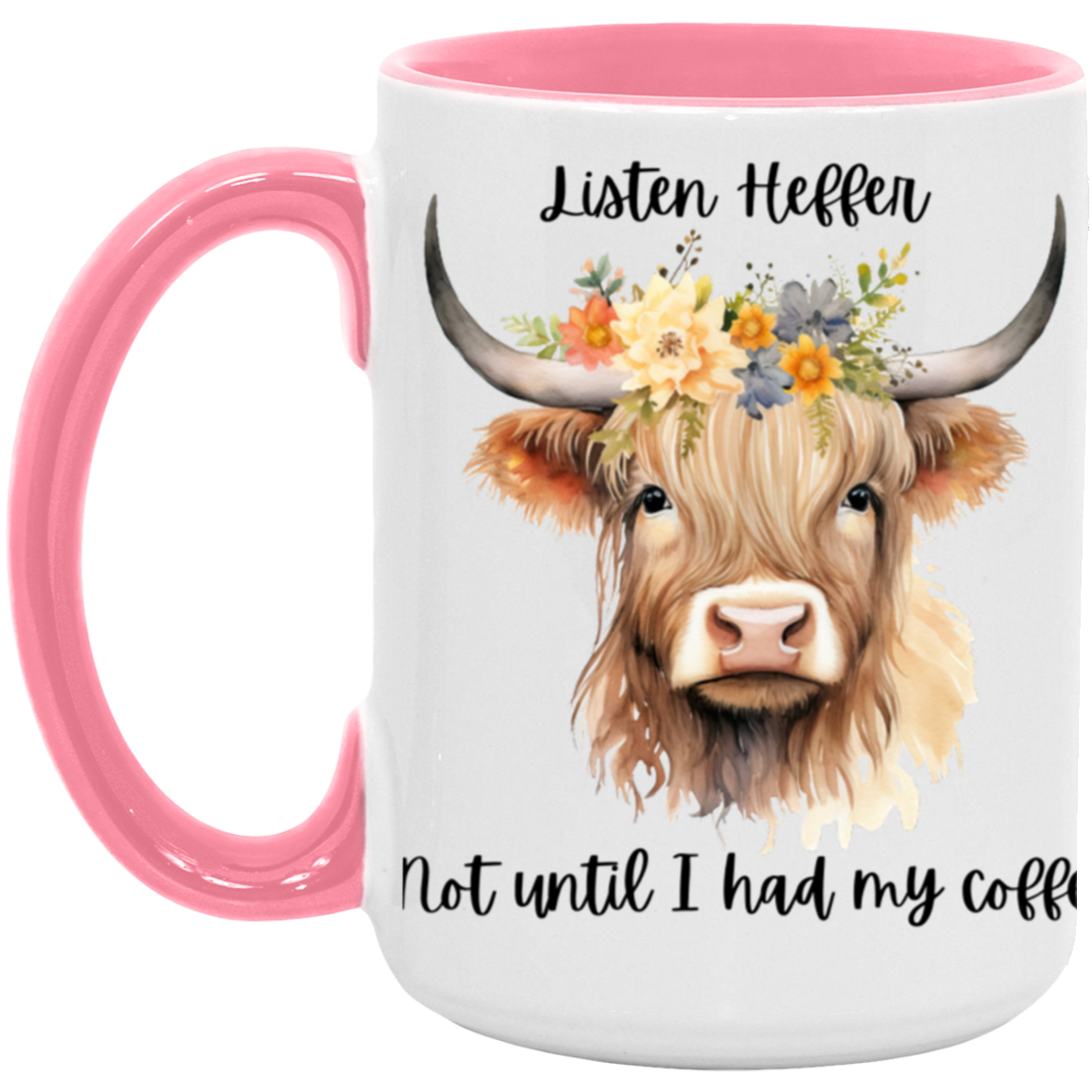 Listen Heffer Not until I had my coffee! This mug makes a wonderful gift for the coffee and cow lovers in your life! Comes in multiple colors.