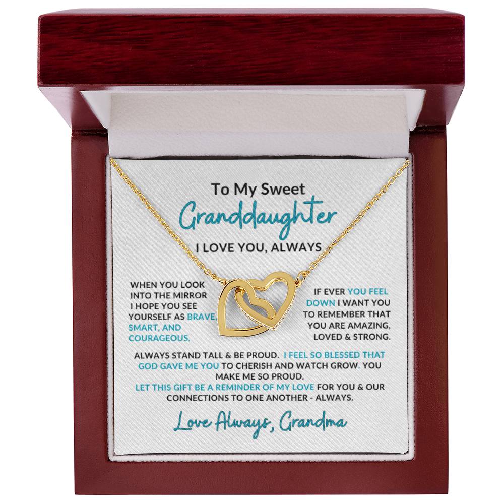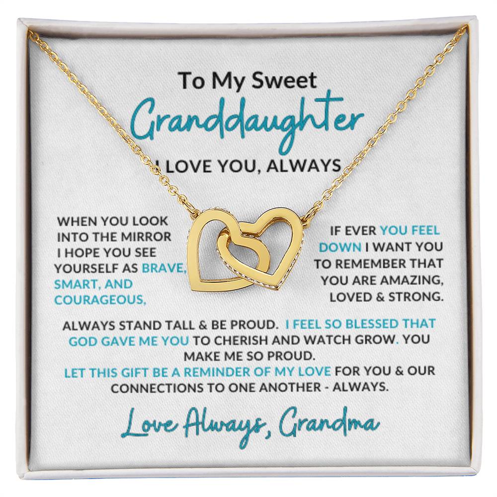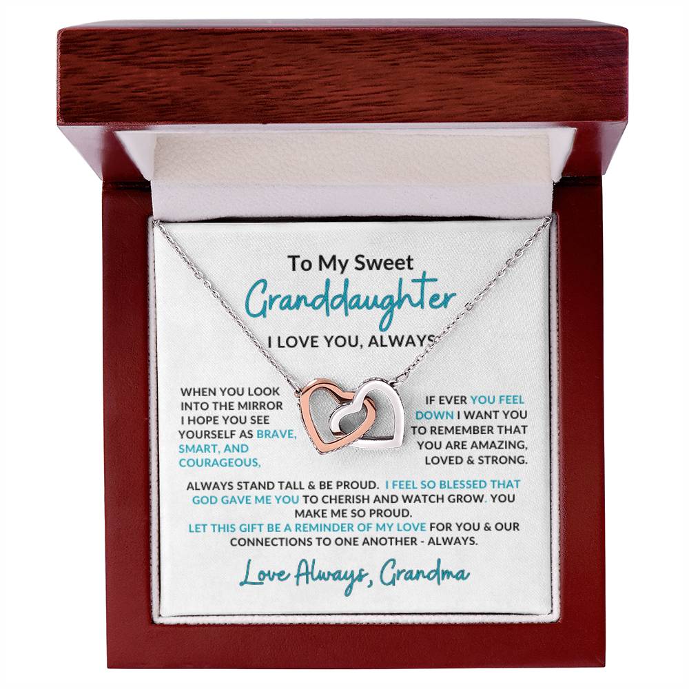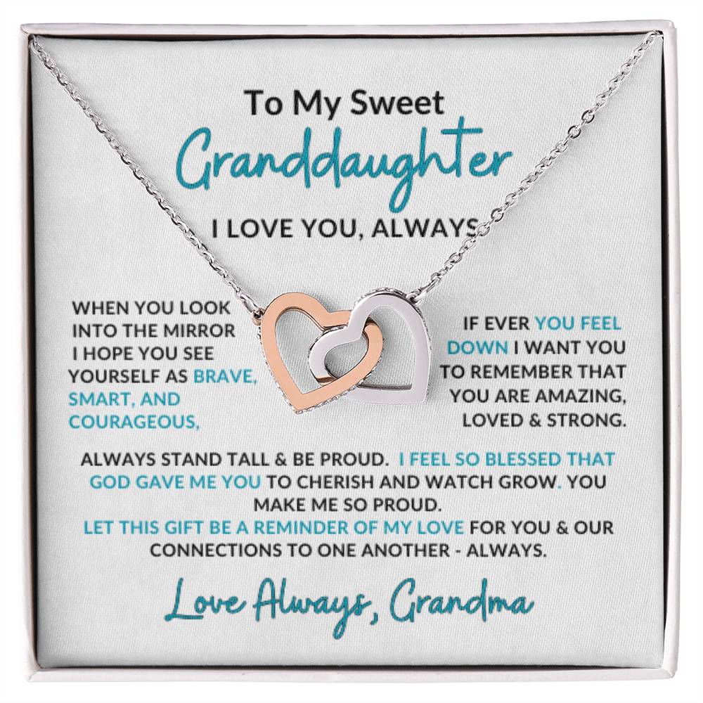 To My Sweet Granddaughter, I LOVE YOU, ALWAYS WHEN YOU LOOK INTO THE MIRROR I HOPE YOU SEE YOURSELF AS BRAVE, SMART, AND COURAGEOUS, IF EVER YOU FEEL DOWN I WANT YOU TO REMEMBER THAT YOU ARE AMAZING, LOVED & STRONG. ALWAYS STAND TALL & BE PROUD. I FEEL SO BLESSED THAT GOD GAVE ME YOU TO CHERISH AND WATCH GROW. YOU MAKE ME SO PROUD. LET THIS GIFT BE A REMINDER OF MY LOVE FOR YOU & OUR CONNECTIONS TO ONE ANOTHER - ALWAYS. Love Always, Grandma