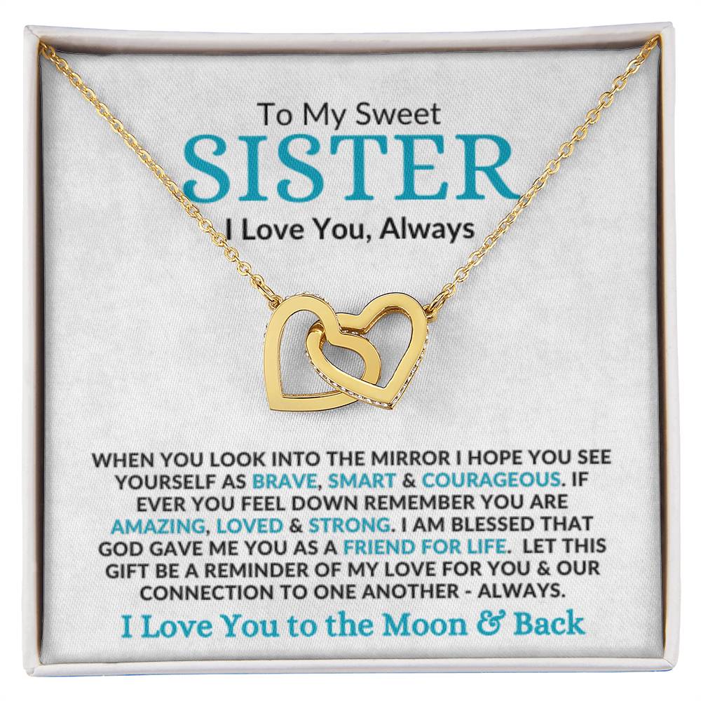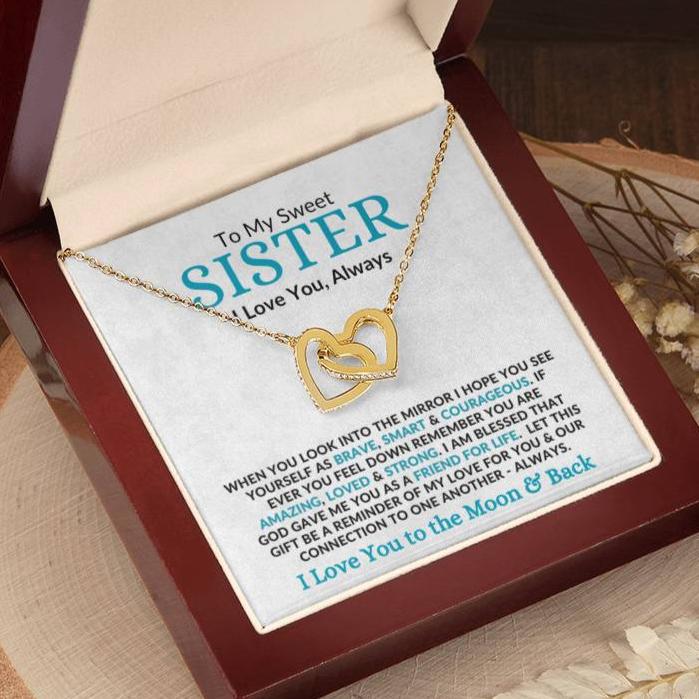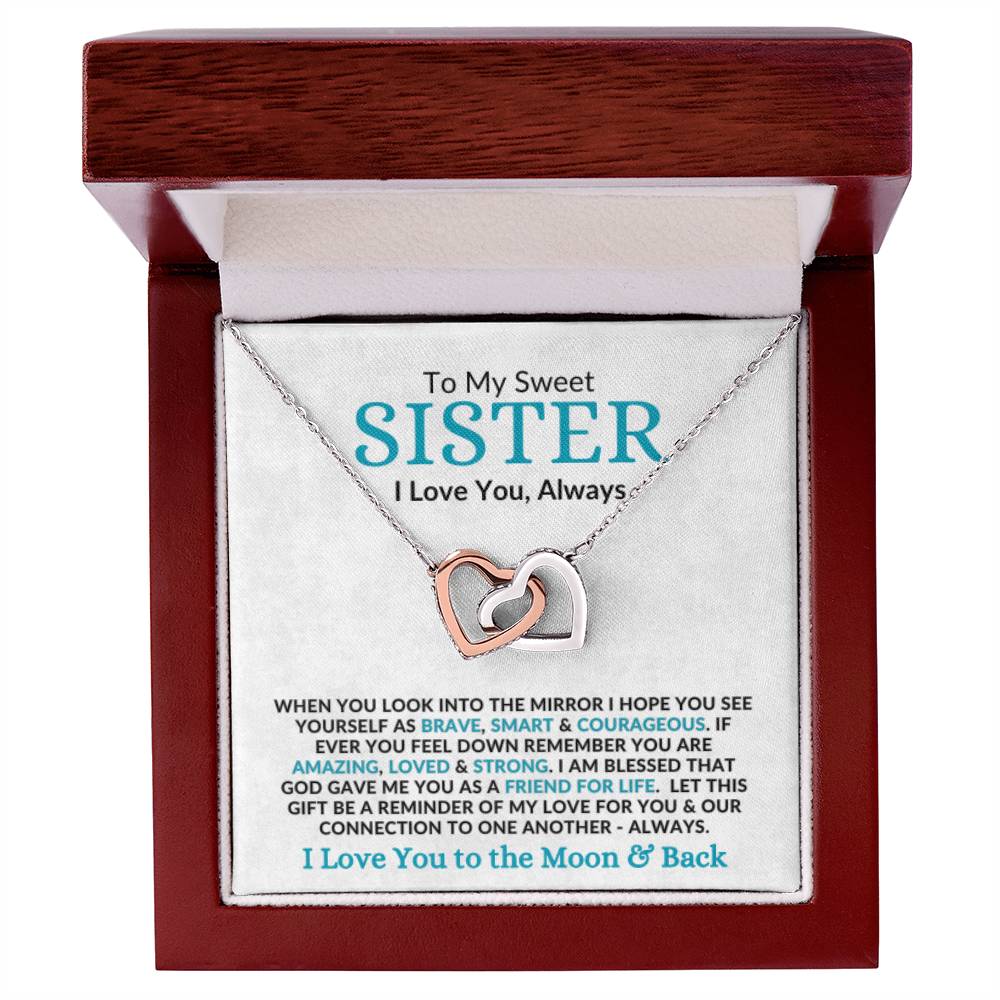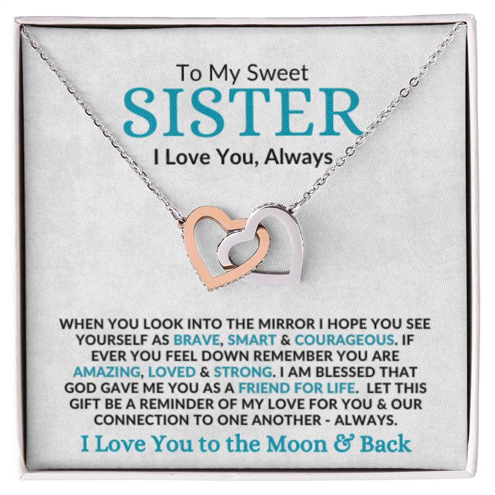 To My Sweet SISTER I Love You, Always WHEN YOU LOOK INTO THE MIRROR I HOPE YOU SEE YOURSELF AS BRAVE, SMART & COURAGEOUS. IF EVER YOU FEEL DOWN REMEMBER YOU ARE AMAZING, LOVED & STRONG. I AM BLESSED THAT GOD GAVE ME YOU AS A FRIEND FOR LIFE. LET THIS GIFT BE A REMINDER OF MY LOVE FOR YOU & OUR CONNECTION TO ONE ANOTHER - ALWAYS. I Love You to the Moon & Back