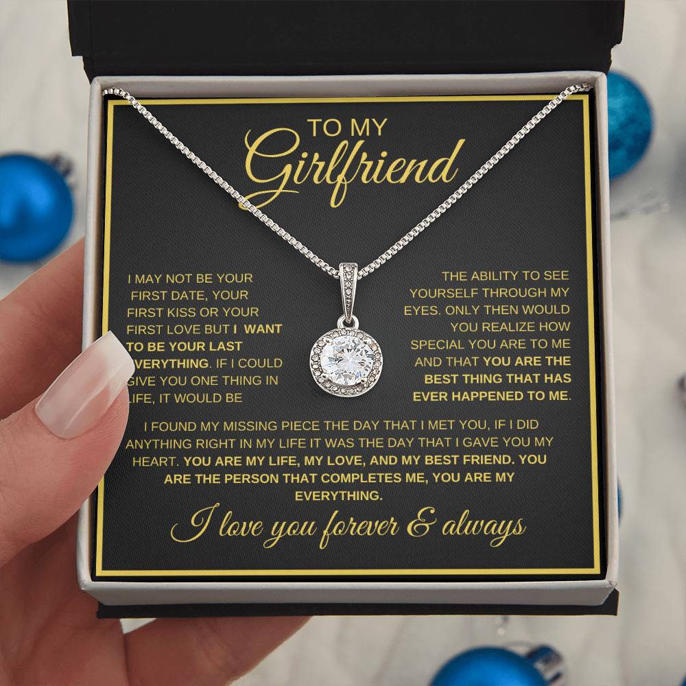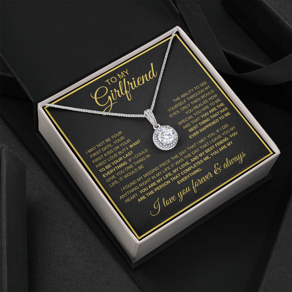 TO MY Girlfriend I MAY NOT BE YOUR FIRST DATE, YOUR FIRST KISS OR YOUR FIRST LOVE BUT I WANT TO BE YOUR LAST EVERYTHING. IF I COULD GIVE YOU ONE THING IN LIFE, IT WOULD BE THE ABILITY TO SEE YOURSELF THROUGH MY EYES. ONLY THEN WOULD YOU REALIZE HOW SPECIAL YOU ARE TO ME AND THAT YOU ARE THE BEST THING THAT HAS EVER HAPPENED TO ME. I FOUND MY MISSING PIECE THE DAY THAT I MET YOU, IF I DID ANYTHING RIGHT IN MY LIFE IT WAS THE DAY THAT I GAVE YOU MY HEART. YOU ARE MY LIFE, MY LOVE, AND MY BEST FRIEND. YOU ARE THE PERSON THAT COMPLETES ME, YOU ARE MY EVERYTHING. I love you forever & always