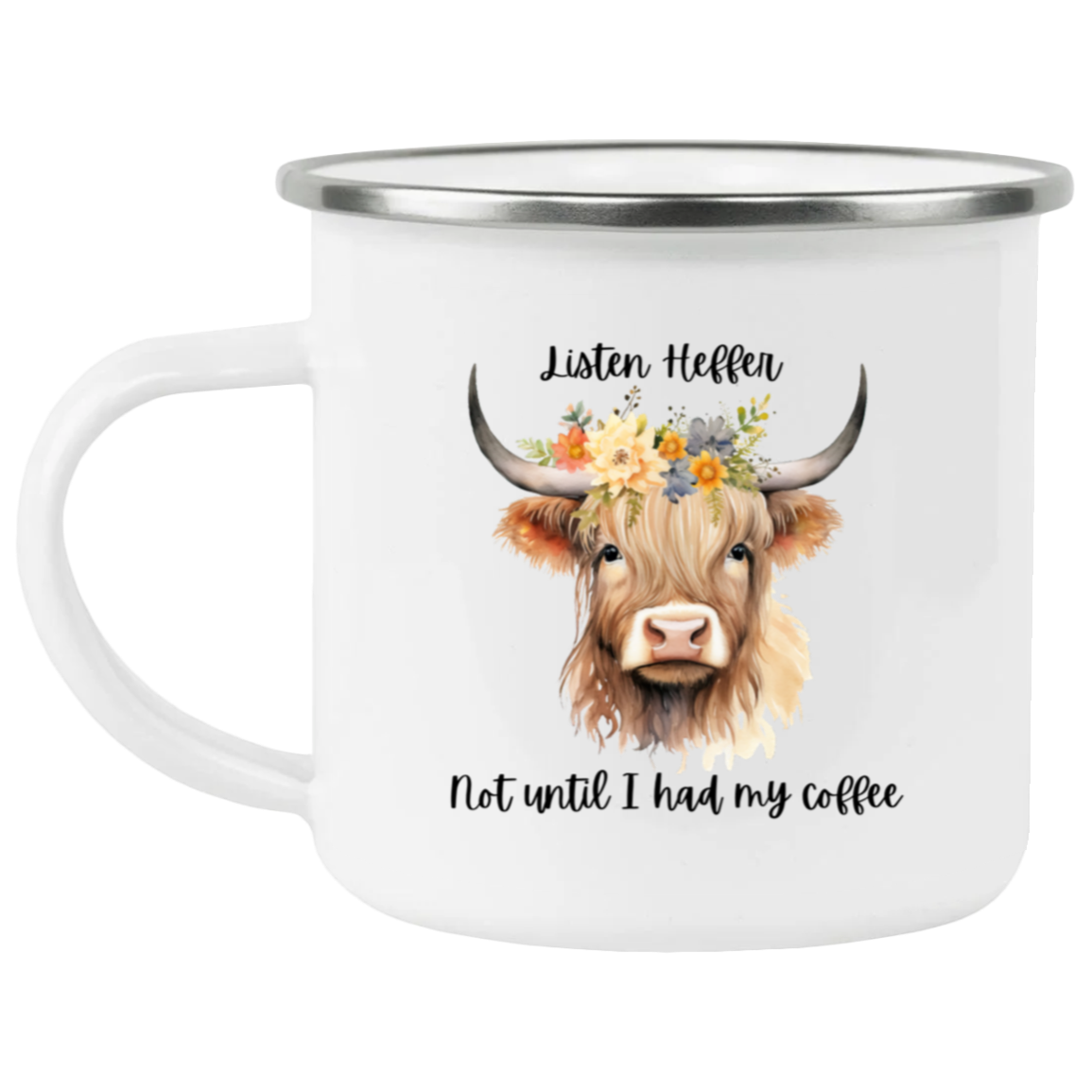 One Sided Enamel Camping Mug | Highland Cow | Listen Heffer