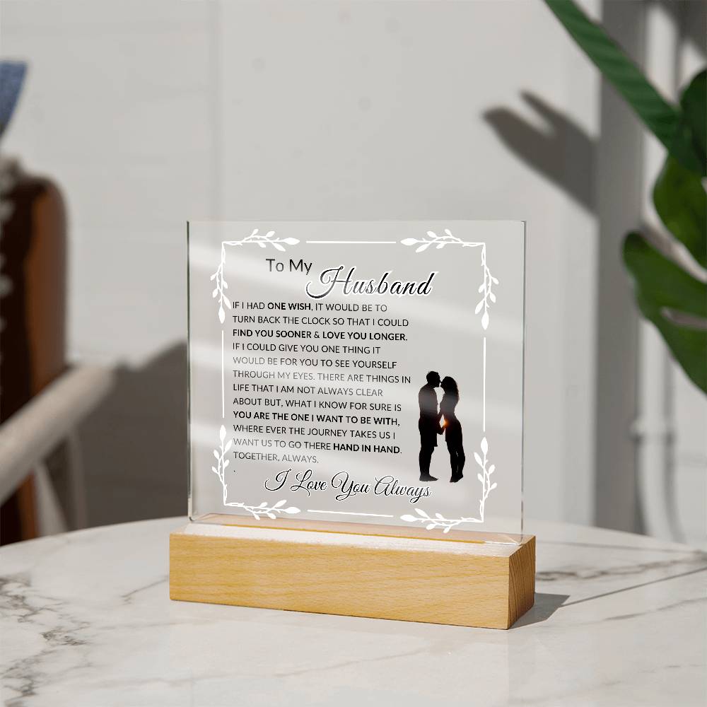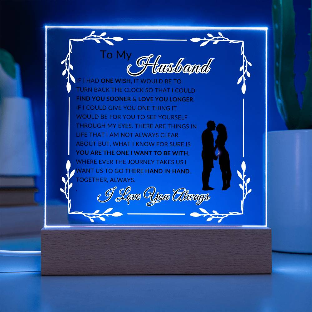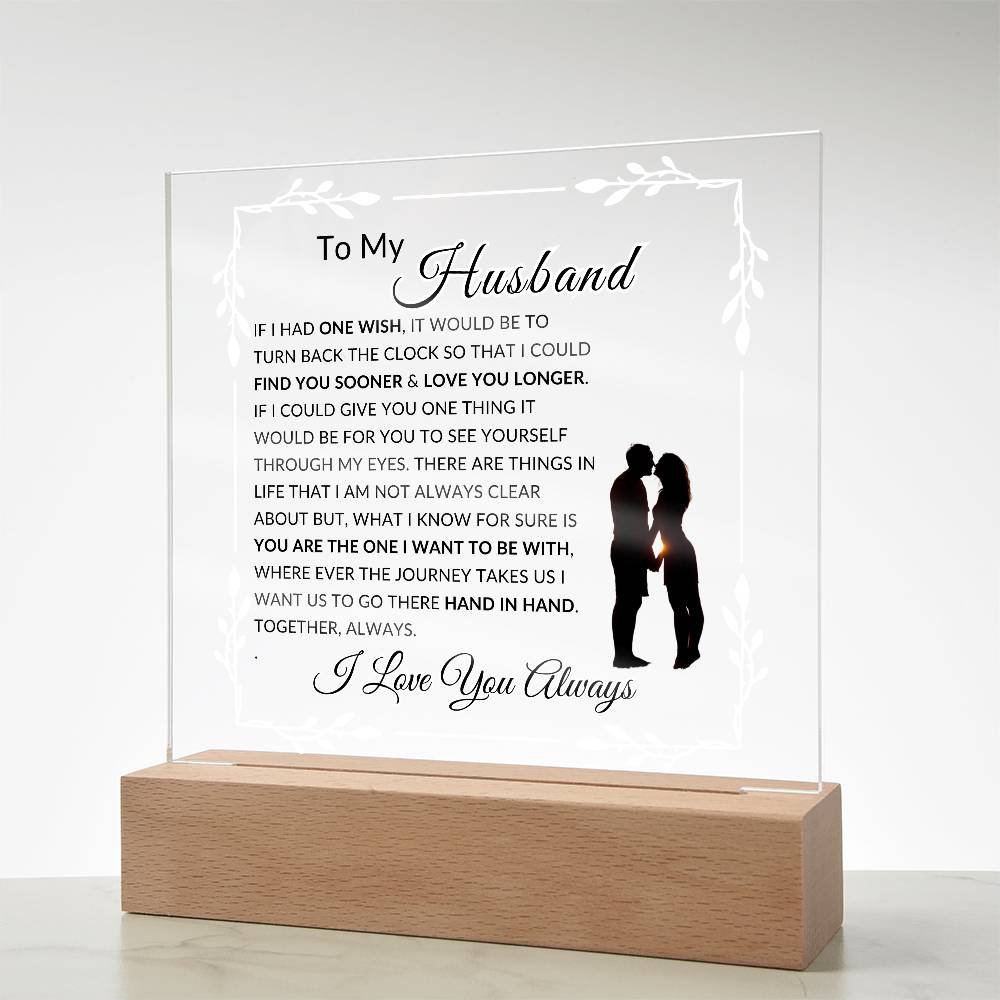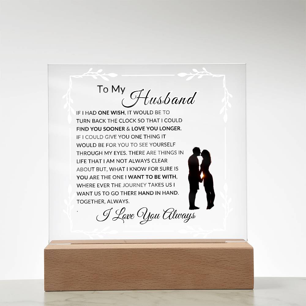 To My Husband, IF I HAD ONE WISH, IT WOULD BE TO TURN BACK THE CLOCK SO THAT I COULD FIND YOU SOONER & LOVE YOU LONGER. IF I COULD GIVE YOU ONE THING IT WOULD BE FOR YOU TO SEE YOURSELF THROUGH MY EYES. THERE ARE THINGS IN LIFE THAT I AM NOT ALWAYS CLEAR ABOUT BUT, WHAT I KNOW FOR SURE IS YOU ARE THE ONE I WANT TO BE WITH, WHERE EVER THE JOURNEY TAKES US I WANT US TO GO THERE HAND IN HAND. TOGETHER, ALWAYS. I Love You