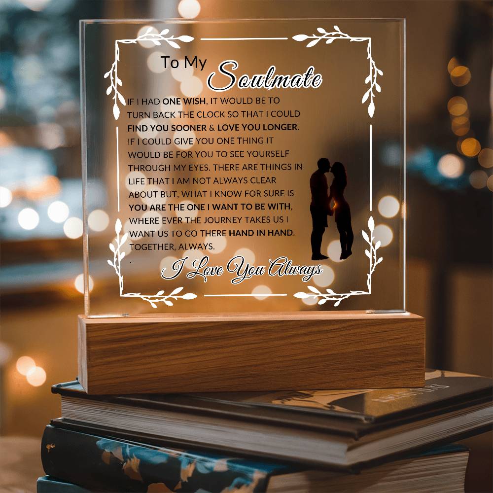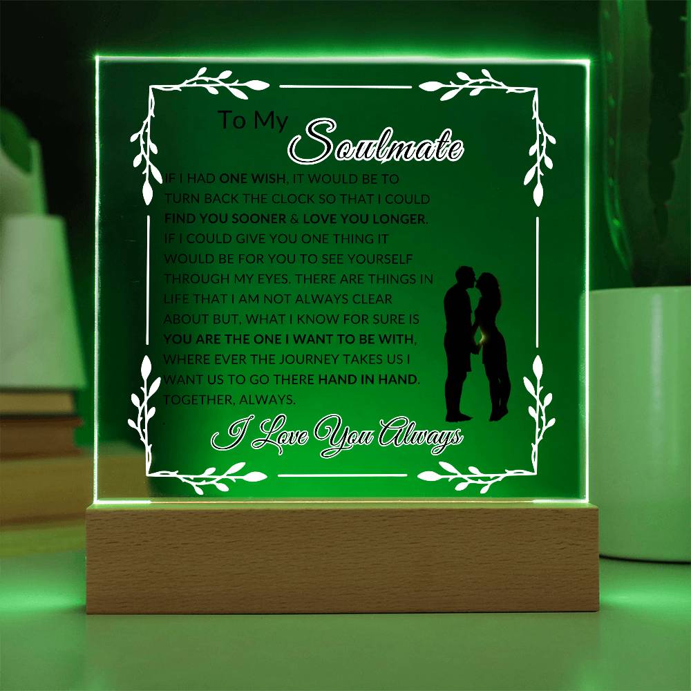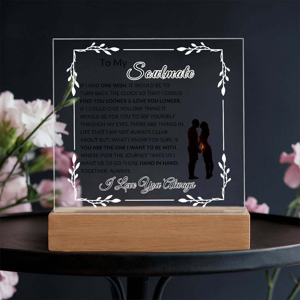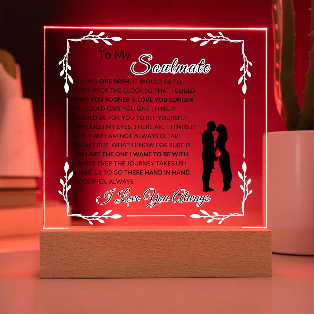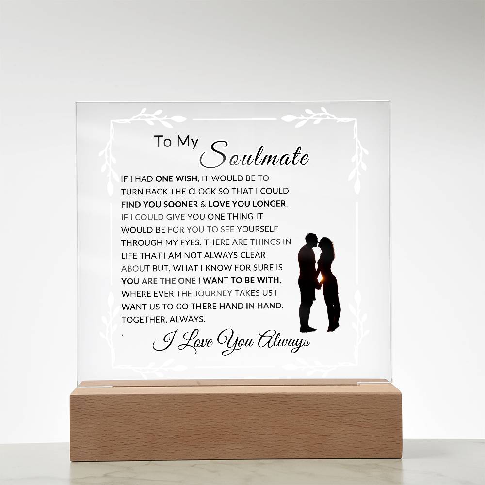 To My Soulmate, IF I HAD ONE WISH, IT WOULD BE TO TURN BACK THE CLOCK SO THAT I COULD FIND YOU SOONER & LOVE YOU LONGER. IF I COULD GIVE YOU ONE THING IT WOULD BE FOR YOU TO SEE YOURSELF THROUGH MY EYES. THERE ARE THINGS IN LIFE THAT I AM NOT ALWAYS CLEAR ABOUT BUT, WHAT I KNOW FOR SURE IS YOU ARE THE ONE I WANT TO BE WITH, WHERE EVER THE JOURNEY TAKES US I WANT US TO GO THERE HAND IN HAND, TOGETHER, ALWAYS. I Love You