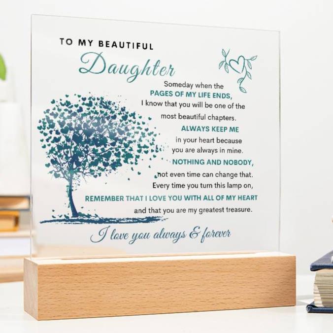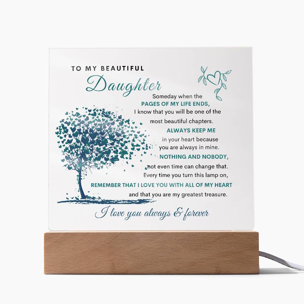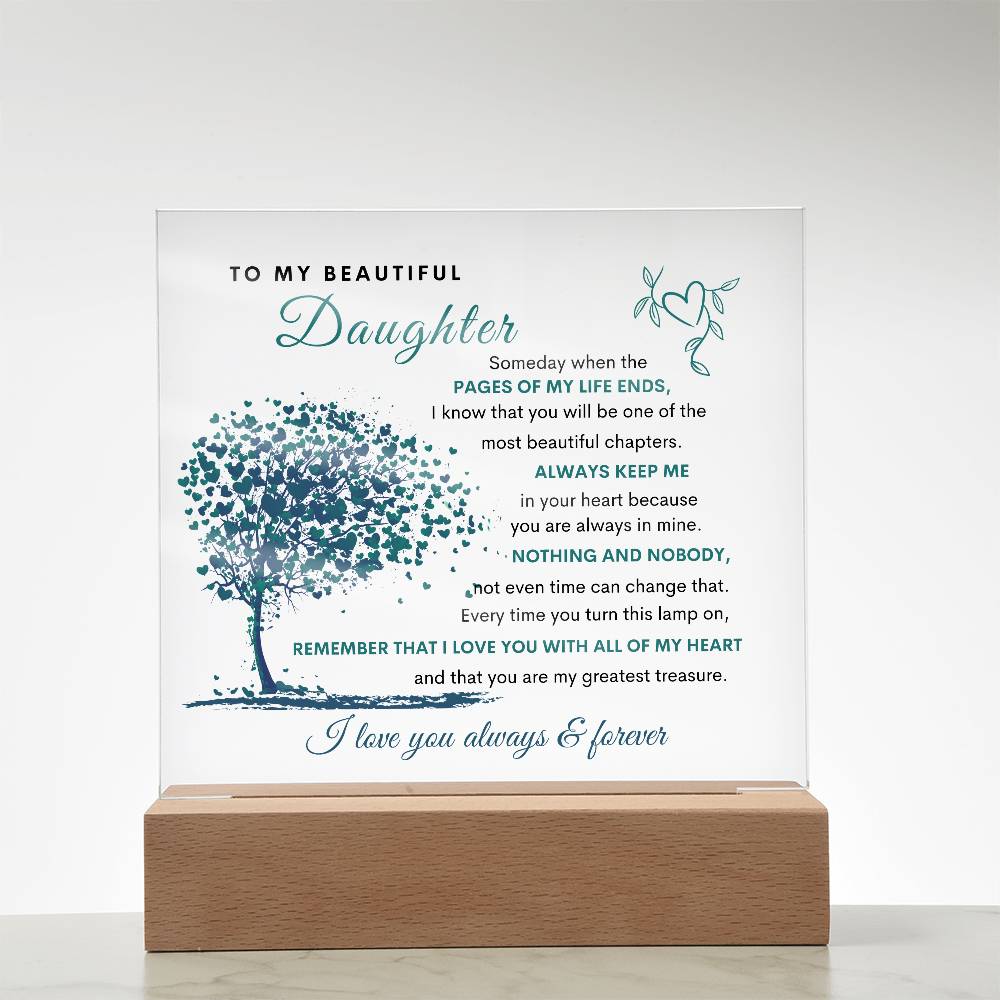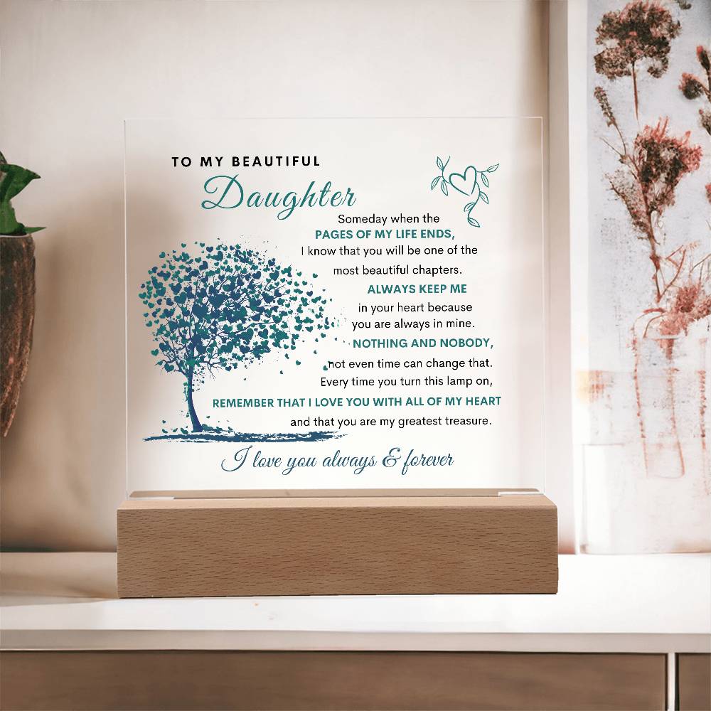 TO MY BEAUTIFUL Daughter Someday when the PAGES OF MY LIFE ENDS, I know that you will be one of the most beautiful chapters. ALWAYS KEEP ME in your heart because you are always in mine. NOTHING AND NOBODY, not even time can change that. Every time you turn this lamp on, REMEMBER THAT I LOVE YOU WITH ALL OF MY HEART and that you are my greatest treasure. I love you always & forever