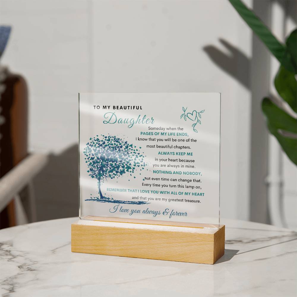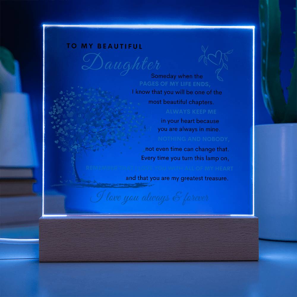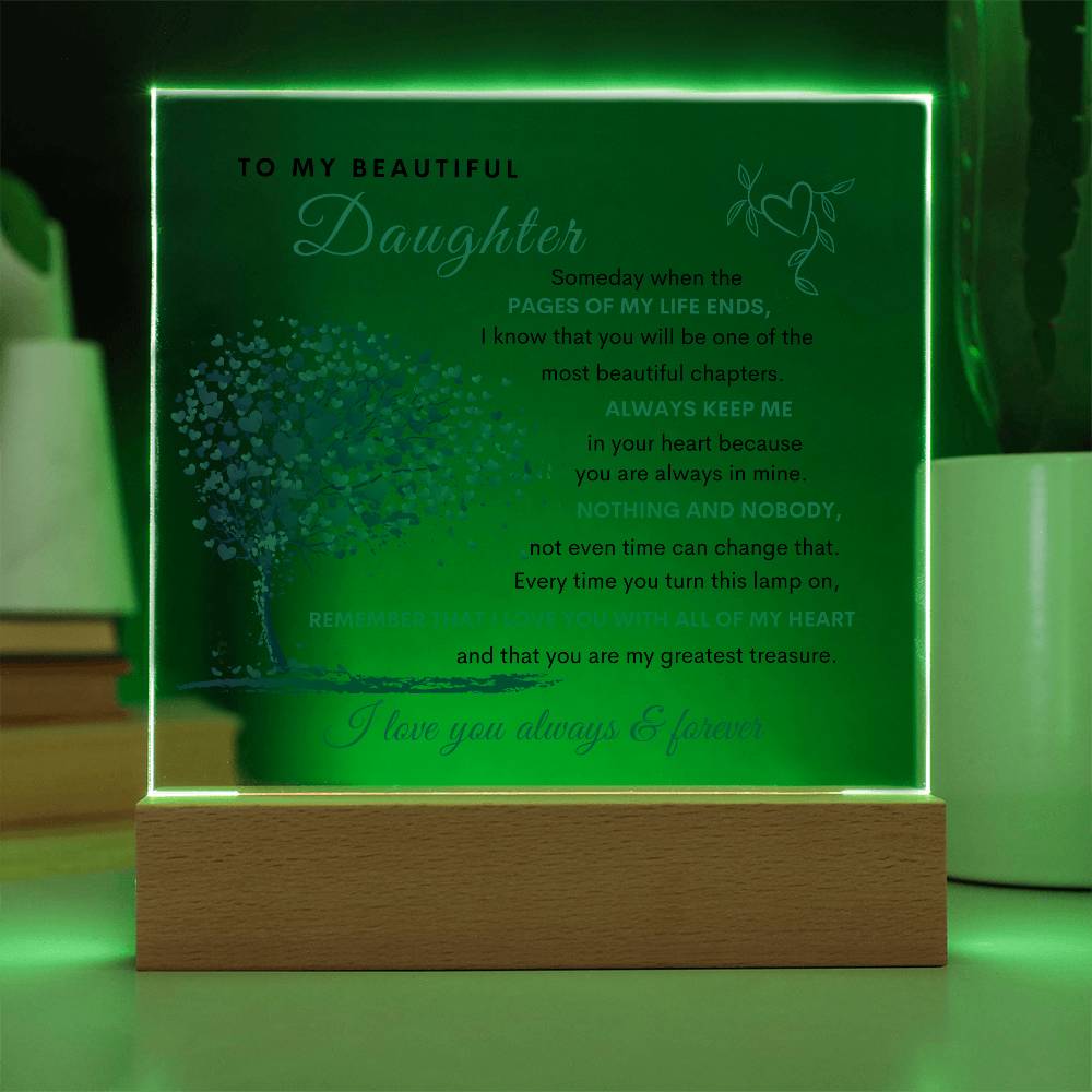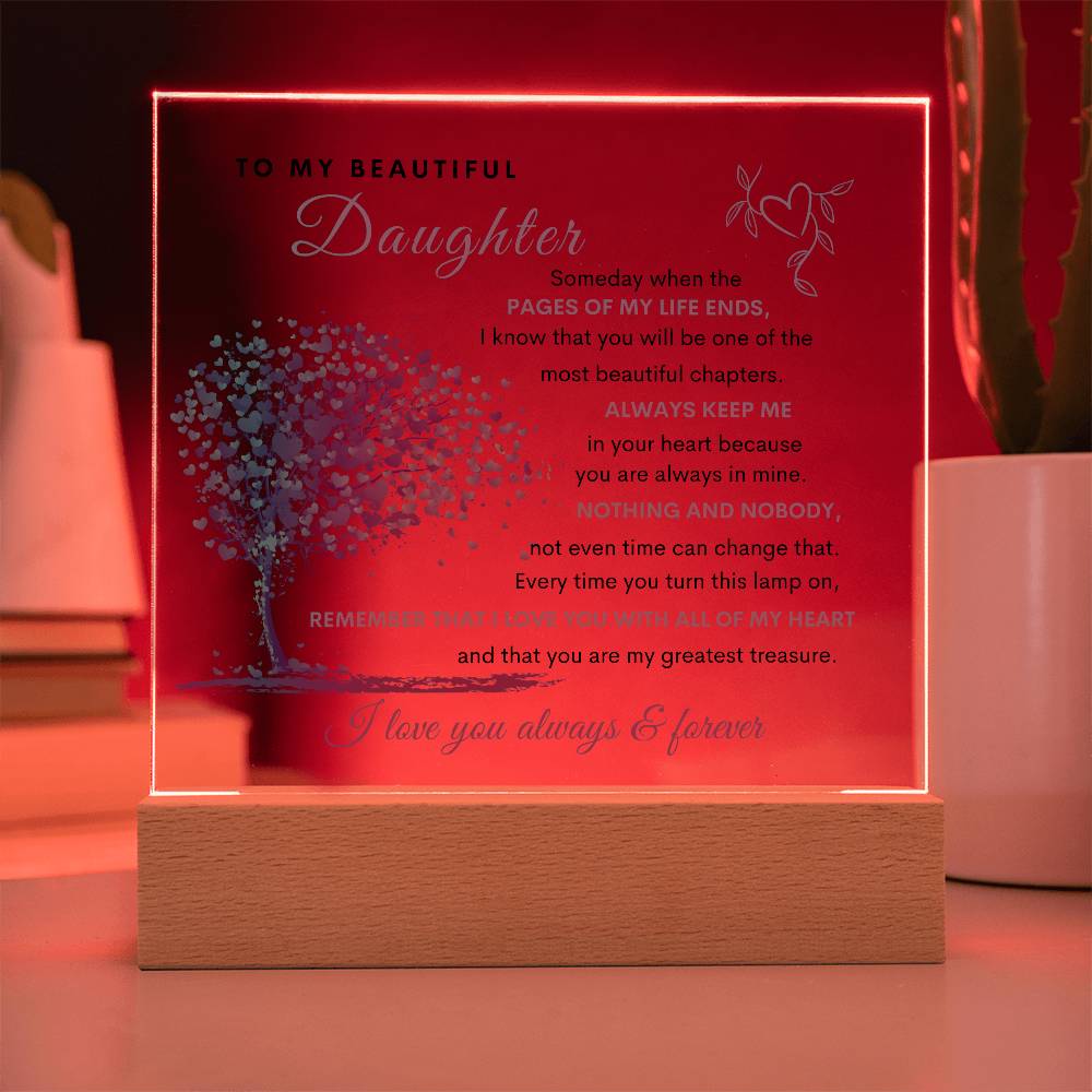TO MY BEAUTIFUL Daughter Someday when the PAGES OF MY LIFE ENDS, I know that you will be one of the most beautiful chapters. ALWAYS KEEP ME in your heart because you are always in mine. NOTHING AND NOBODY, not even time can change that. Every time you turn this lamp on, REMEMBER THAT I LOVE YOU WITH ALL OF MY HEART and that you are my greatest treasure. I love you always & forever