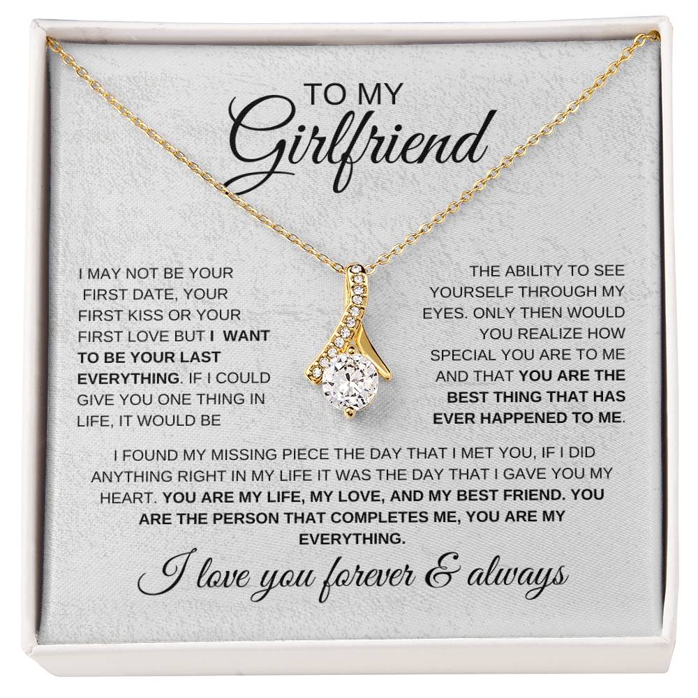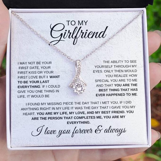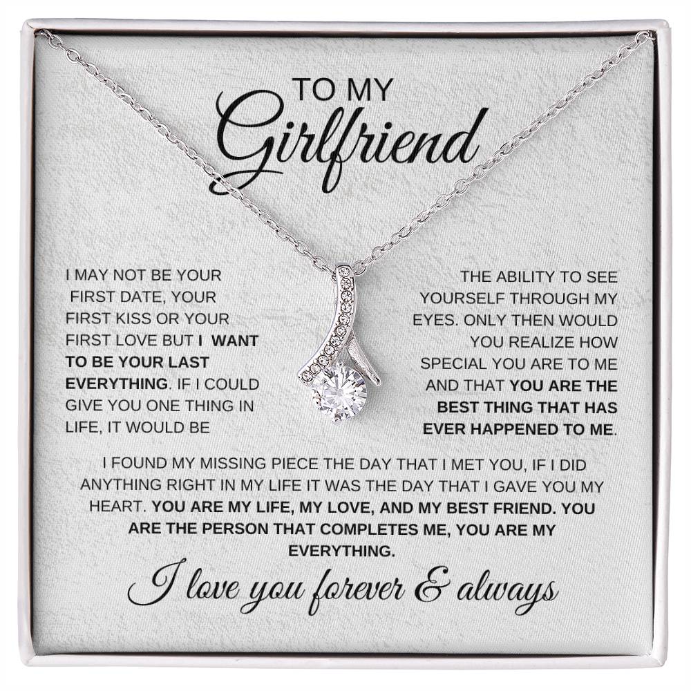TO MY Girlfriend I MAY NOT BE YOUR FIRST DATE, YOUR FIRST KISS OR YOUR FIRST LOVE BUT I WANT TO BE YOUR LAST EVERYTHING. IF I COULD GIVE YOU ONE THING IN LIFE, IT WOULD BE THE ABILITY TO SEE YOURSELF THROUGH MY EYES. ONLY THEN WOULD YOU REALIZE HOW SPECIAL YOU ARE TO ME AND THAT YOU ARE THE BEST THING THAT HAS EVER HAPPENED TO ME. I FOUND MY MISSING PIECE THE DAY THAT I MET YOU, IF I DID ANYTHING RIGHT IN MY LIFE IT WAS THE DAY THAT I GAVE YOU MY HEART. YOU ARE MY LIFE, MY LOVE, AND MY BEST FRIEND. YOU ARE THE PERSON THAT COMPLETES ME, YOU ARE MY EVERYTHING. I love you forever & always