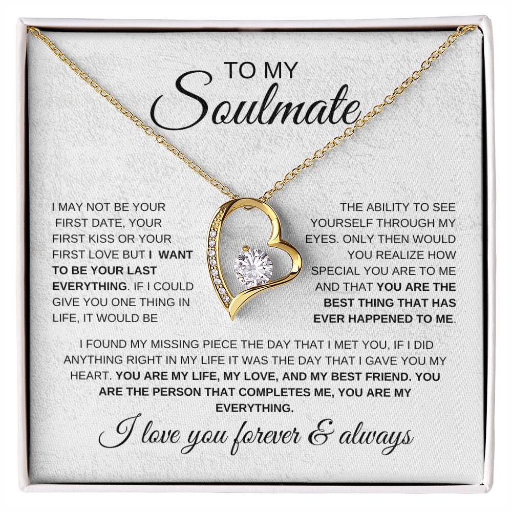 TO MY Soulmate I MAY NOT BE YOUR FIRST DATE, YOUR FIRST KISS OR YOUR FIRST LOVE BUT I WANT TO BE YOUR LAST EVERYTHING. IF I COULD GIVE YOU ONE THING IN LIFE, IT WOULD BE THE ABILITY TO SEE YOURSELF THROUGH MY EYES. ONLY THEN WOULD YOU REALIZE HOW SPECIAL YOU ARE TO ME AND THAT YOU ARE THE BEST THING THAT HAS EVER HAPPENED TO ME. I FOUND MY MISSING PIECE THE DAY THAT I MET YOU, IF I DID ANYTHING RIGHT IN MY LIFE IT WAS THE DAY THAT I GAVE YOU MY HEART. YOU ARE MY LIFE, MY LOVE, AND MY BEST FRIEND. YOU ARE THE PERSON THAT COMPLETES ME, YOU ARE MY EVERYTHING. I love you forever & always
