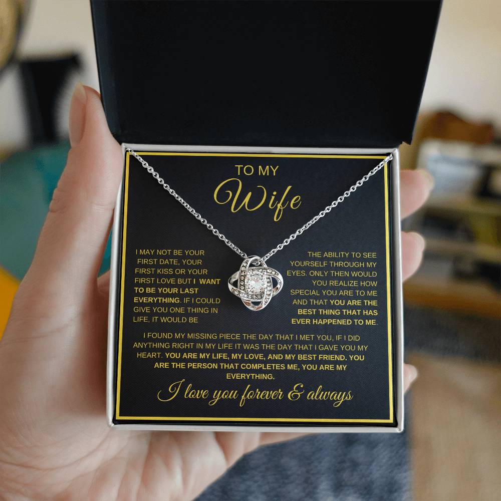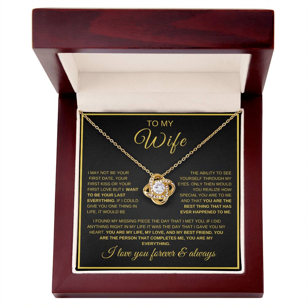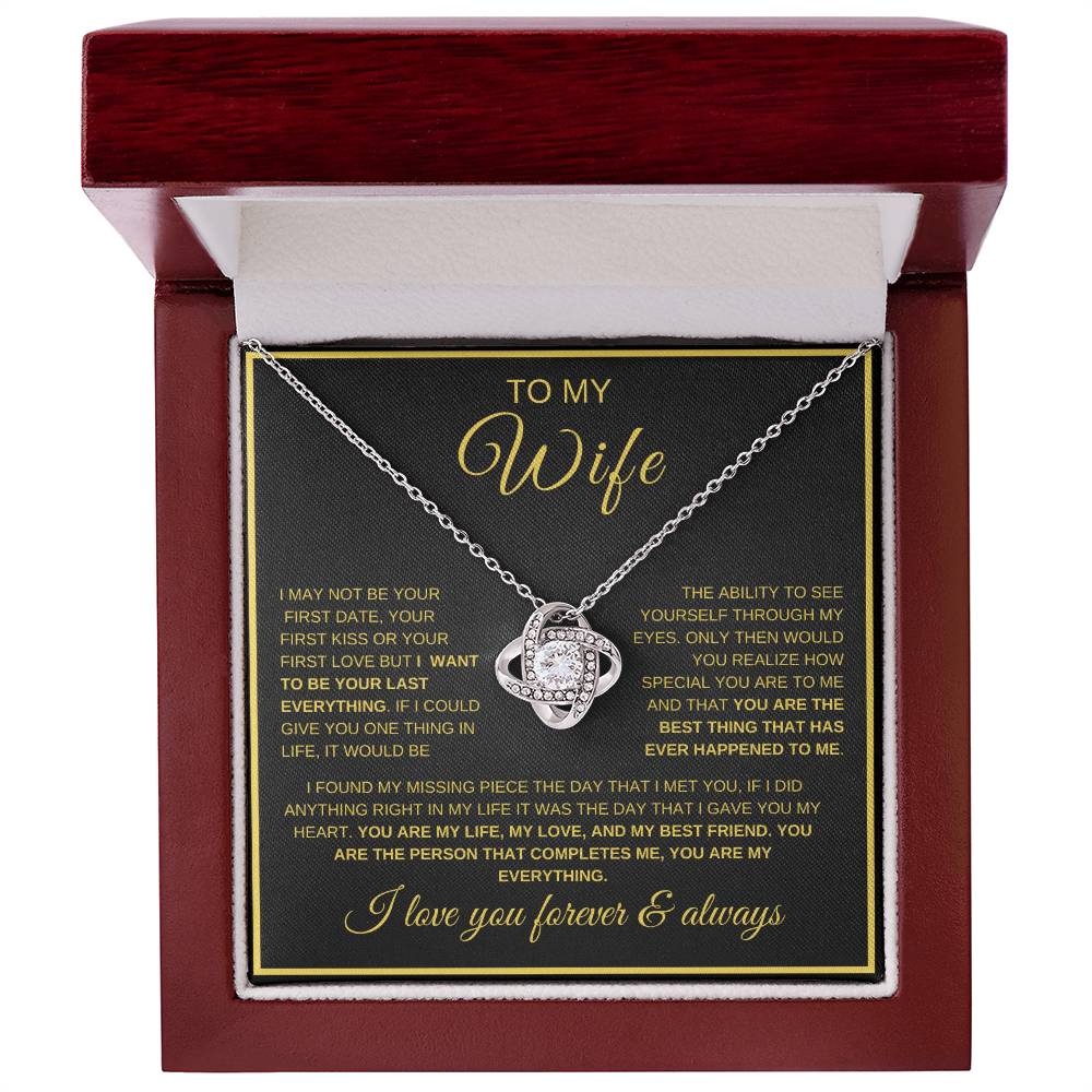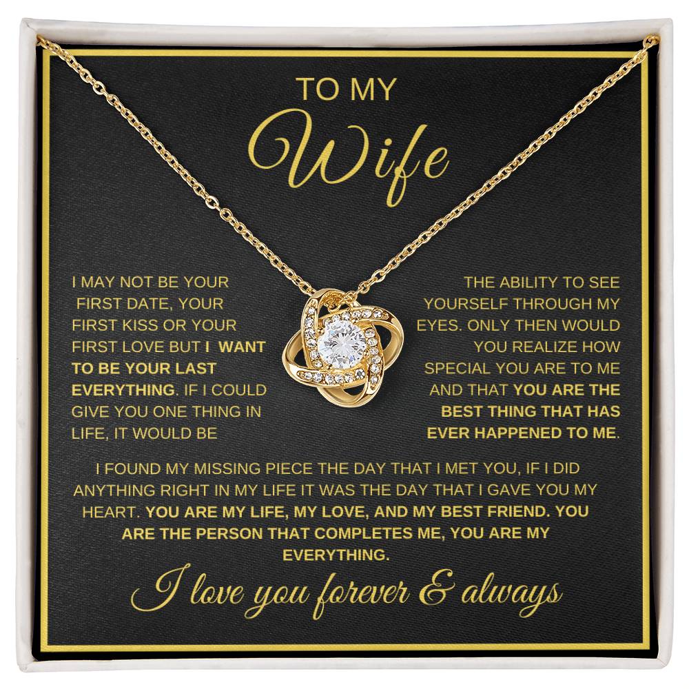 TO MY Wife I MAY NOT BE YOUR FIRST DATE, YOUR FIRST KISS OR YOUR FIRST LOVE BUT I WANT TO BE YOUR LAST EVERYTHING. IF I COULD GIVE YOU ONE THING IN LIFE, IT WOULD BE THE ABILITY TO SEE YOURSELF THROUGH MY EYES. ONLY THEN WOULD YOU REALIZE HOW SPECIAL YOU ARE TO ME AND THAT YOU ARE THE BEST THING THAT HAS EVER HAPPENED TO ME. I FOUND MY MISSING PIECE THE DAY THAT I MET YOU, IF I DID ANYTHING RIGHT IN MY LIFE IT WAS THE DAY THAT I GAVE YOU MY HEART. YOU ARE MY LIFE, MY LOVE, AND MY BEST FRIEND. YOU ARE THE PERSON THAT COMPLETES ME, YOU ARE MY EVERYTHING. I love you forever & always